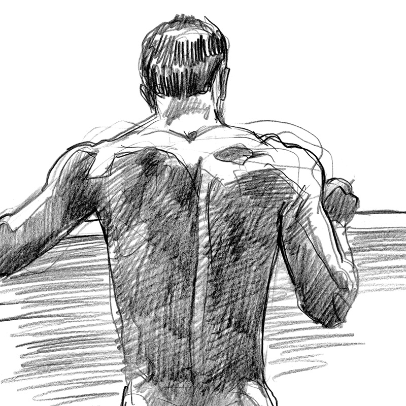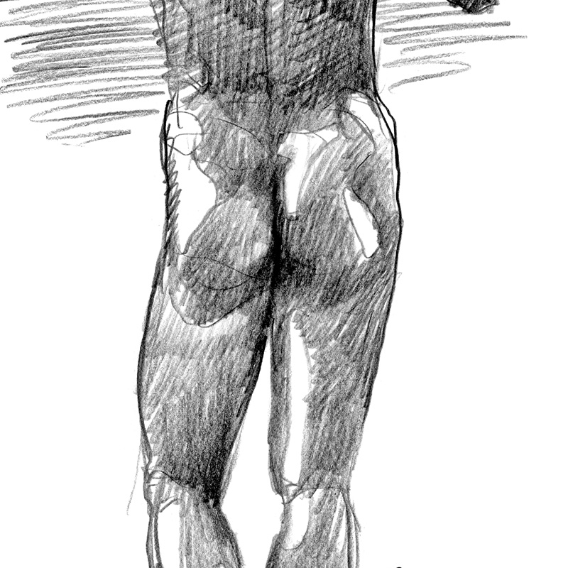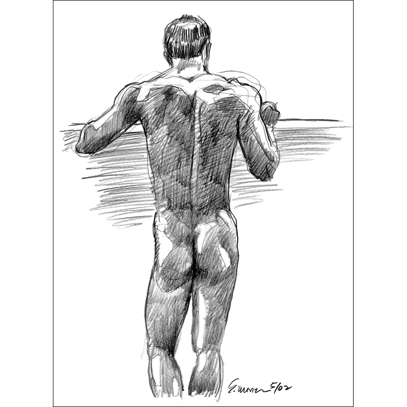 Standing rear nude leaning on wall, deep shadows.