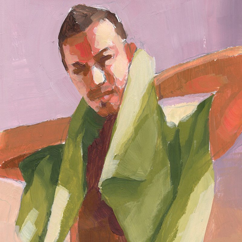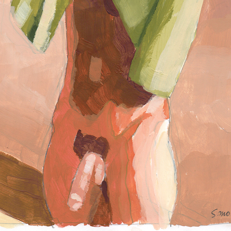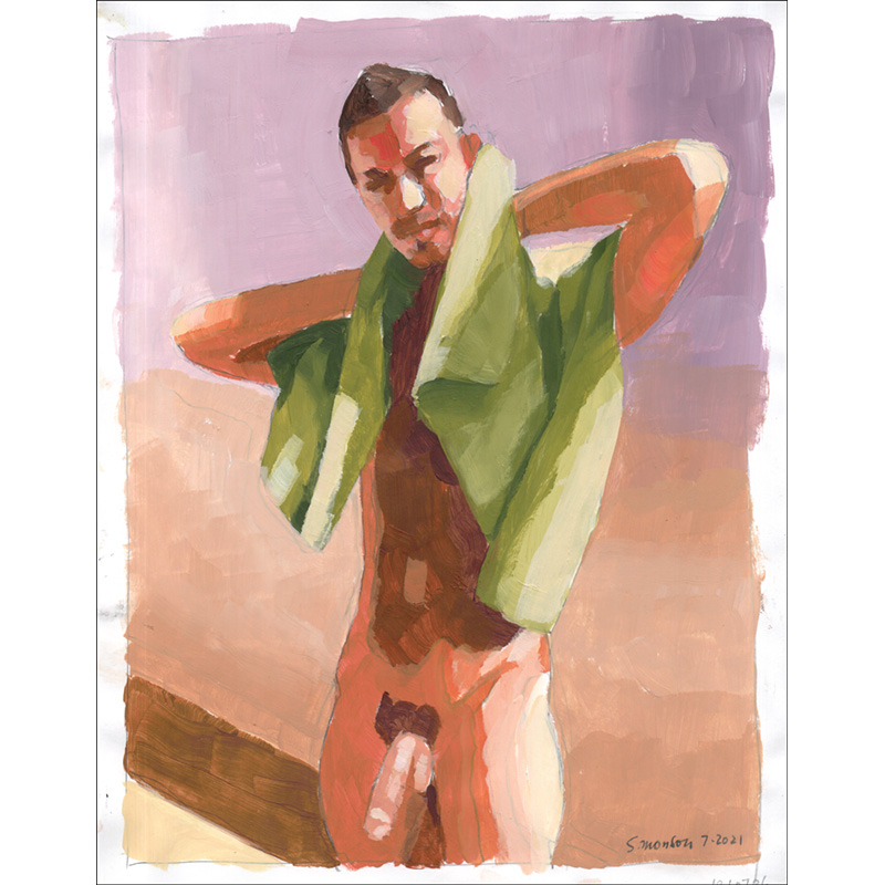 Nude male dries his neck with green towel (acrylic on lightweight paper).