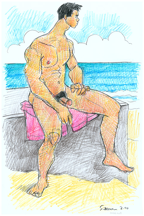 Expressionist male nude sitting on concrete bunker at beach