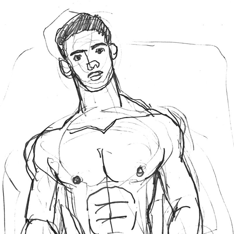 Small drawing of young nude male sitting on chair, hands on thighs.