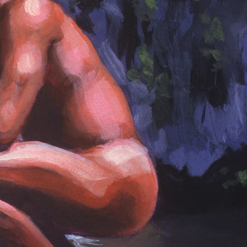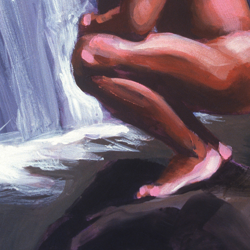 Nude squatting on rock in front of waterfall.