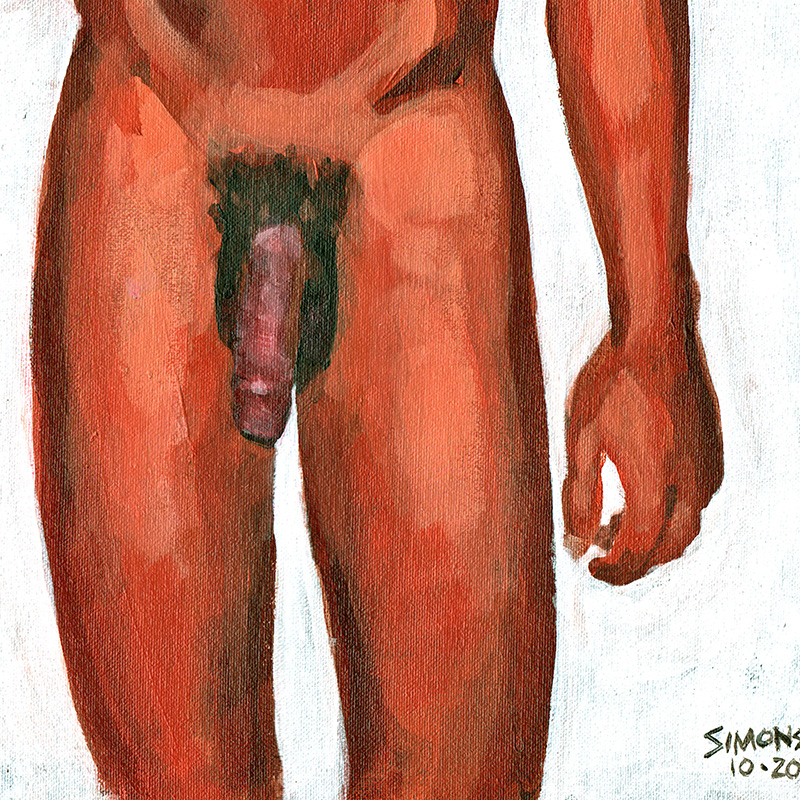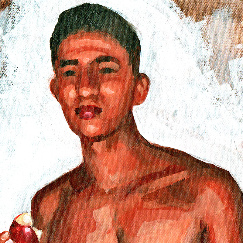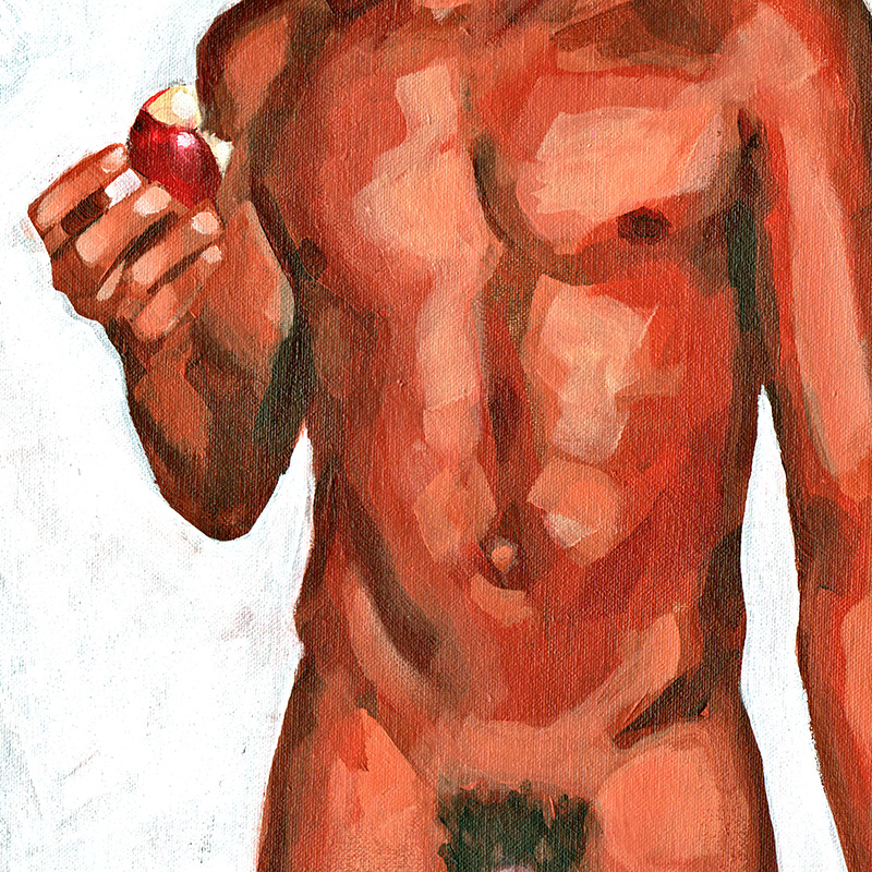 Standing nude of handsome young uncut Colombian eating apple.