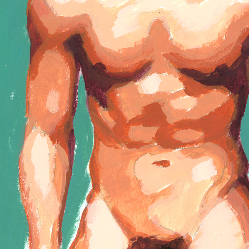 Standing frontal muscular male nude on green bg.