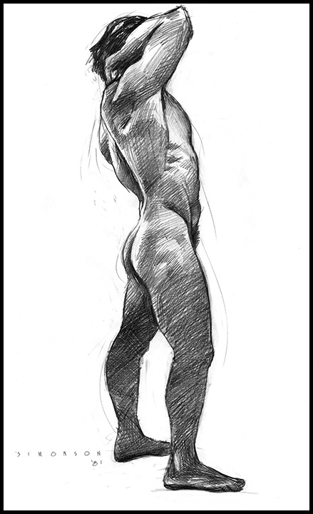 Stretching figure; male nude from rear