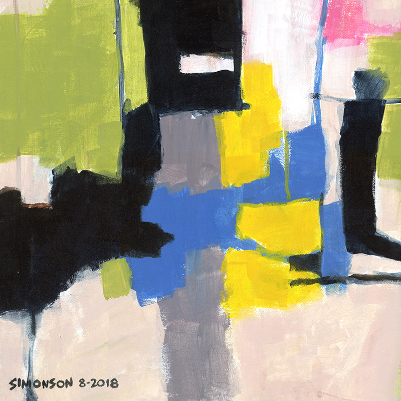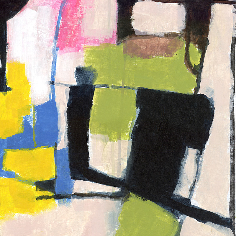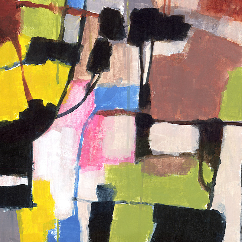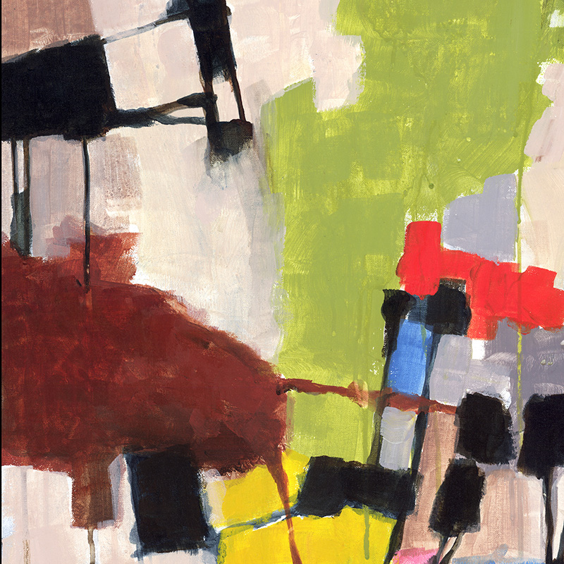 Light, whimsical gestural abstract painting with lots of greens and earth colors.