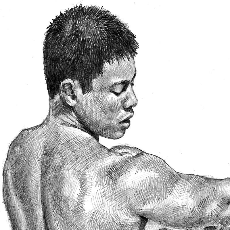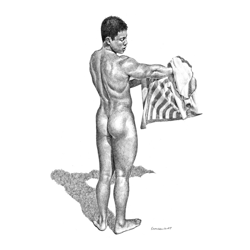 Standing rear Asian male nude toweling off.