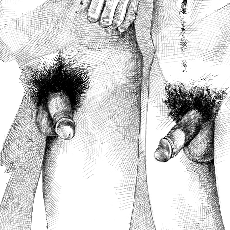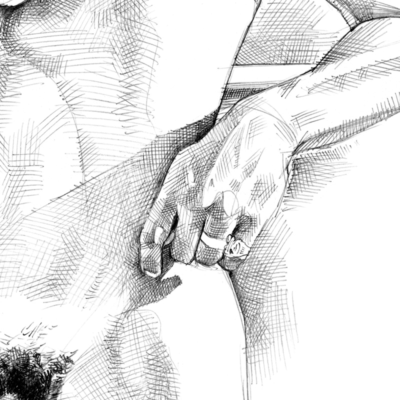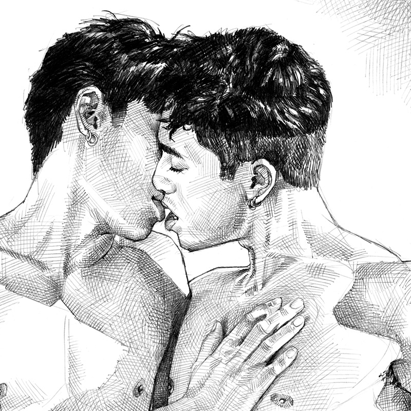 Frontally nude male couple kissing in sunlight.