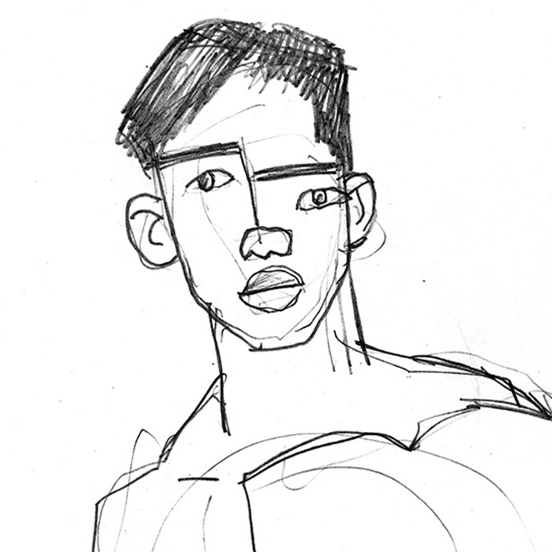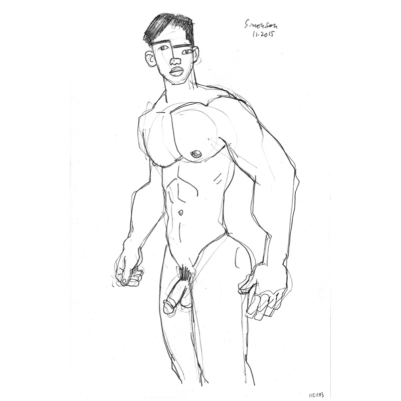 Lean muscular young male nude with distorted facial features.