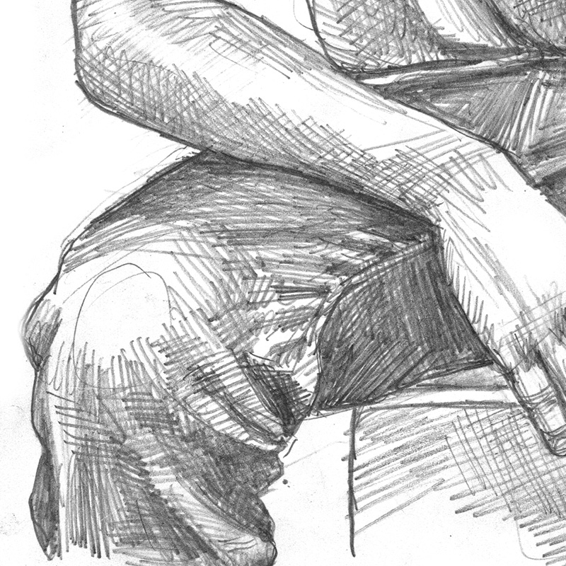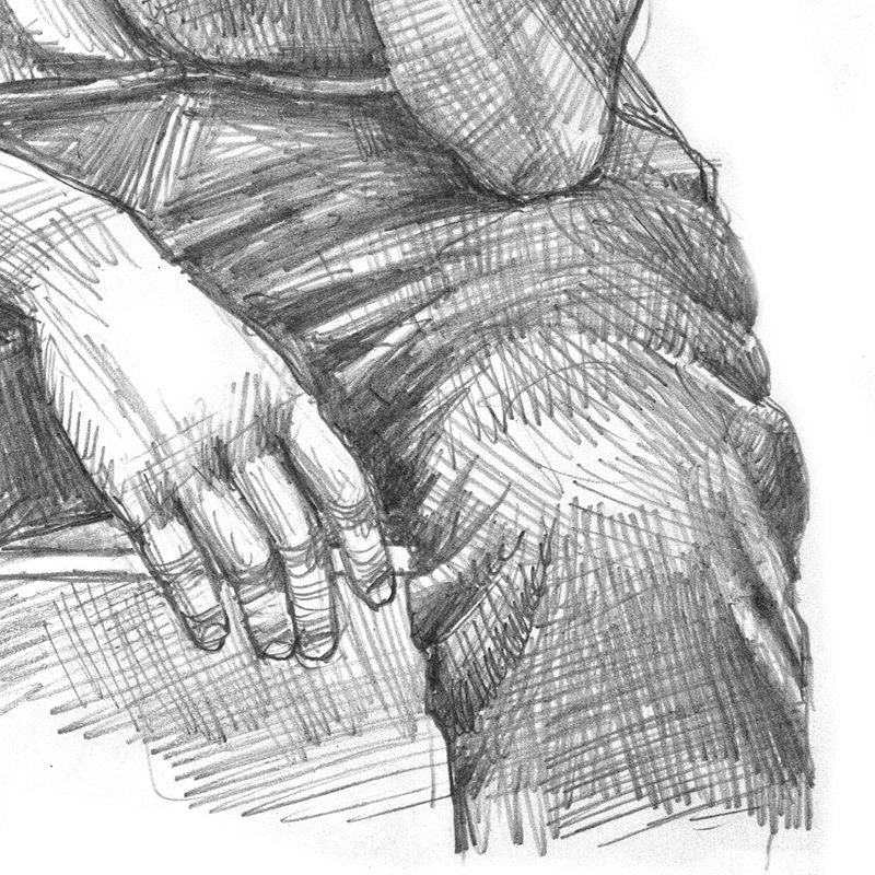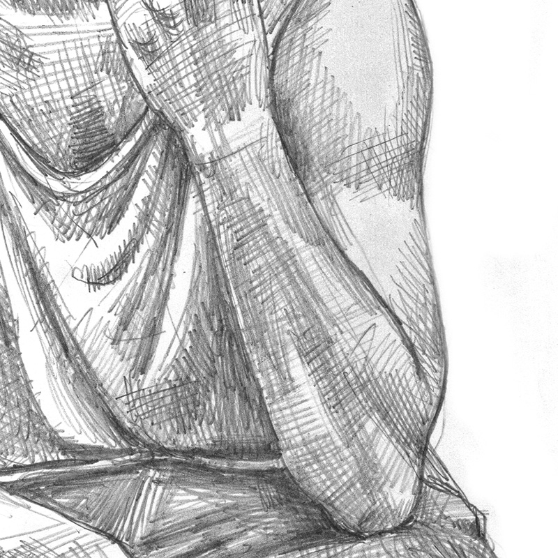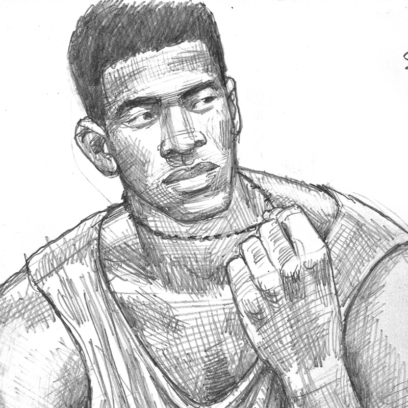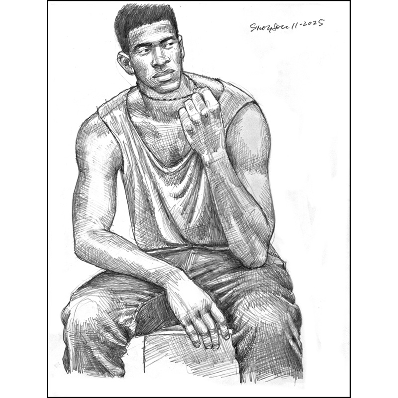 Young Black man in tanktop and jeans sits in reflective pose.