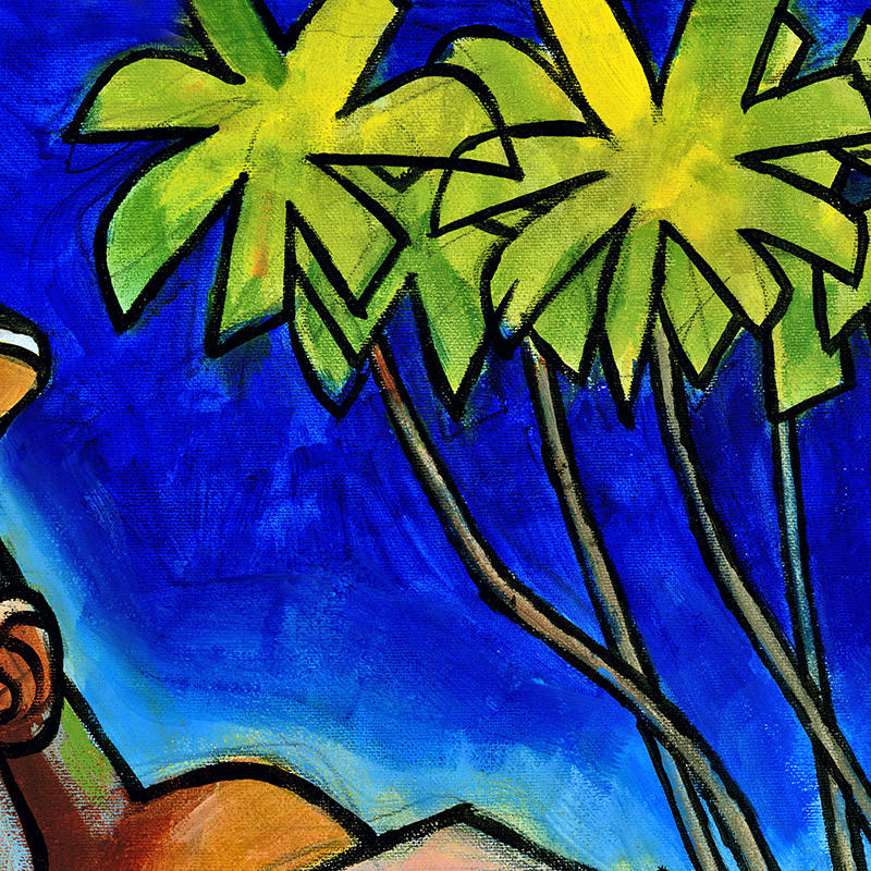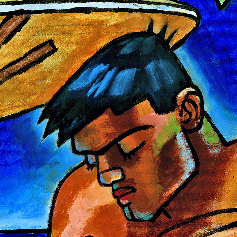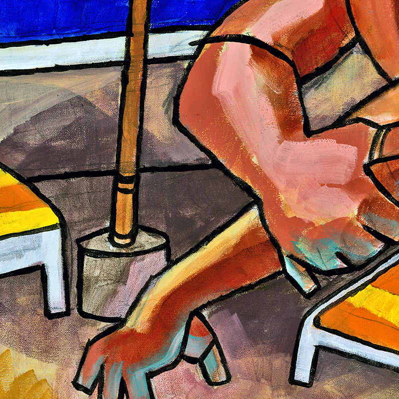 Dark-skinned hunk applies sunblock by pool.