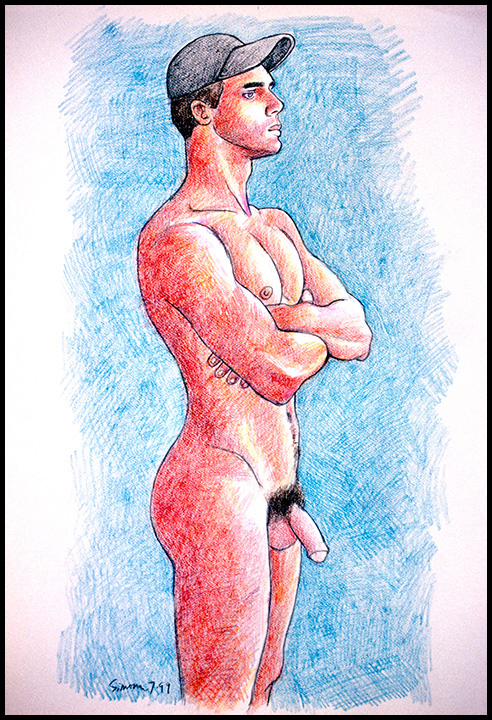 Standing nude of Italian-Argentine uncut male with arms folded (colored pencil on toned paper)