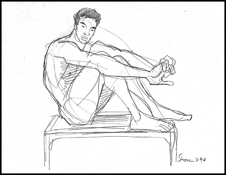 Rough sketch of young Chinese male sitting nude on low table