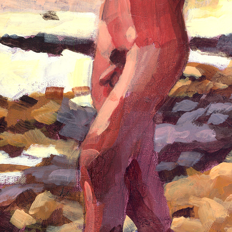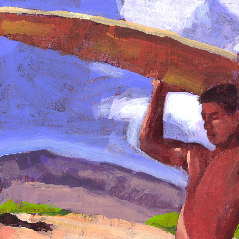 Nude Hawaiian surfer walks along rocky beach, balancing surfboard on his head.