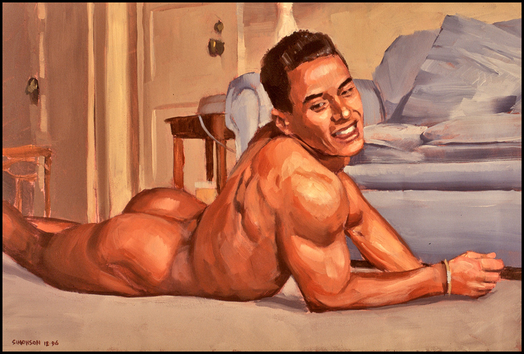 Rear reclining nude, smiling, on floor by sofa