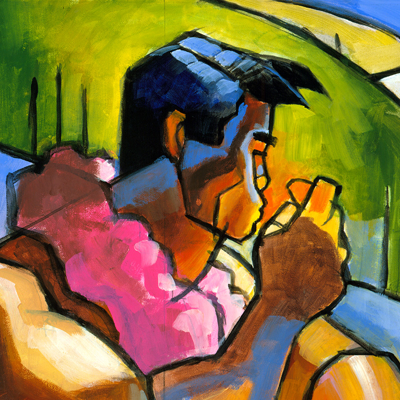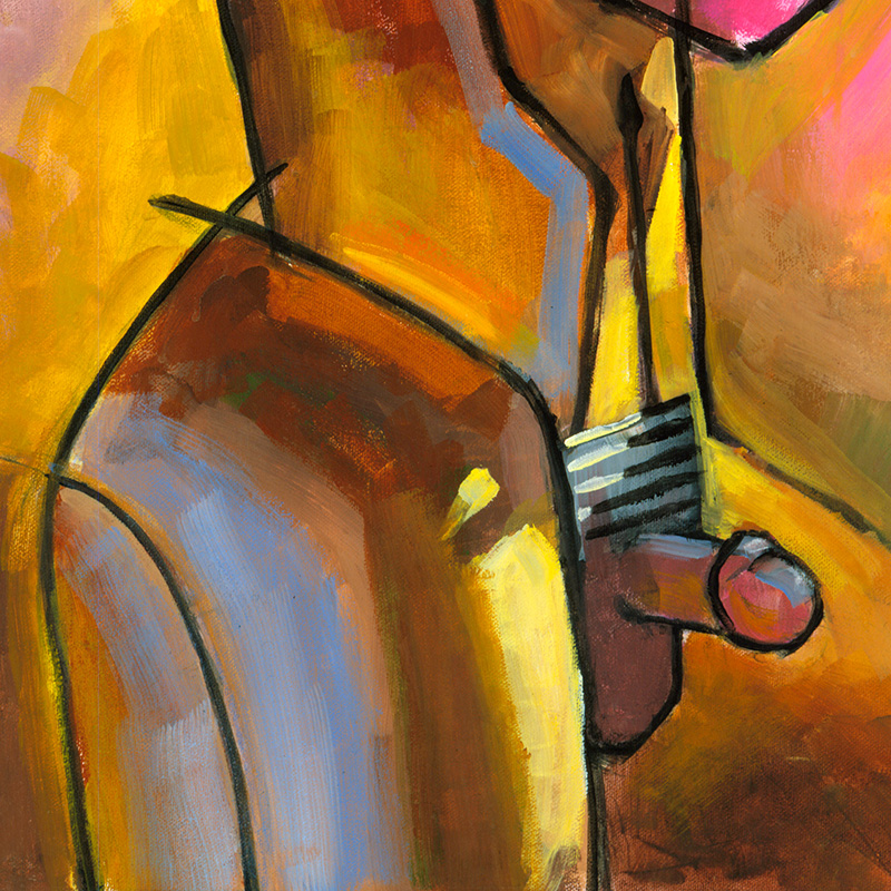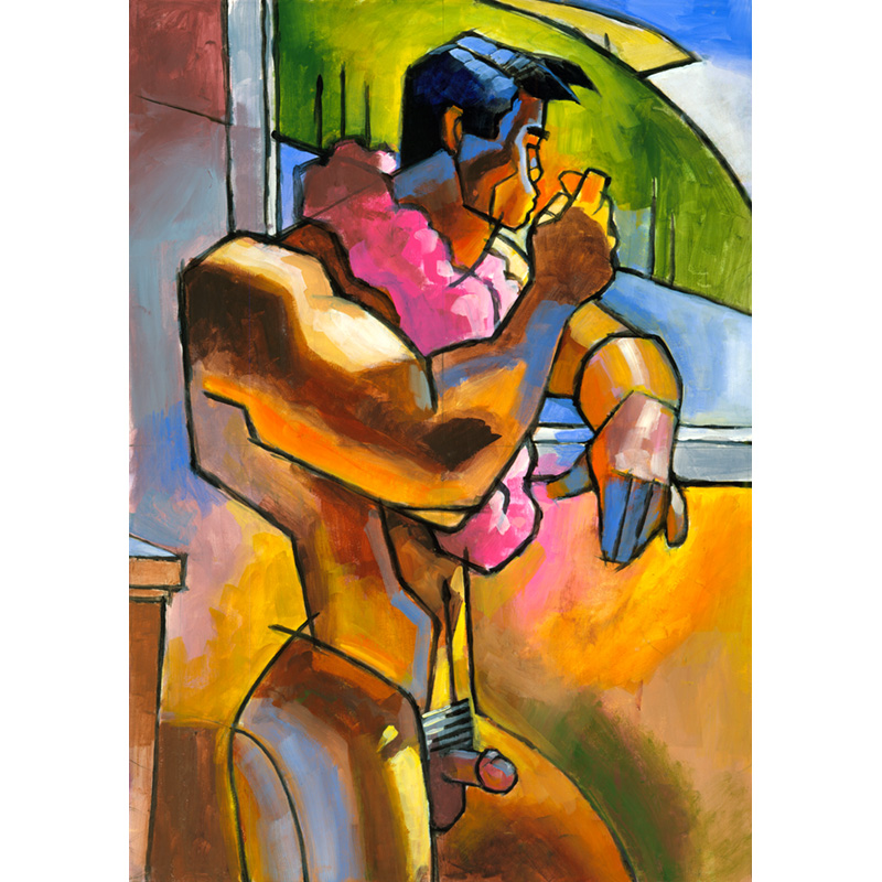 Stylized muscular nude in tropical colors.