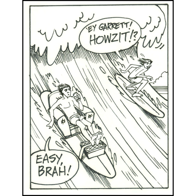 Surfer riding board equipped with easy chair and beer-filled cooler.