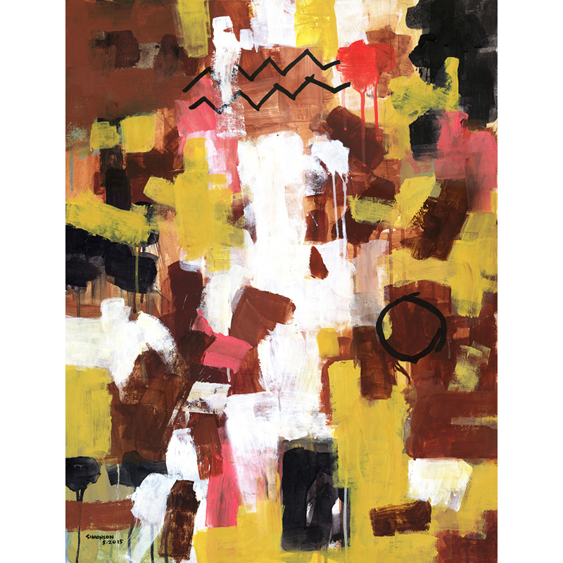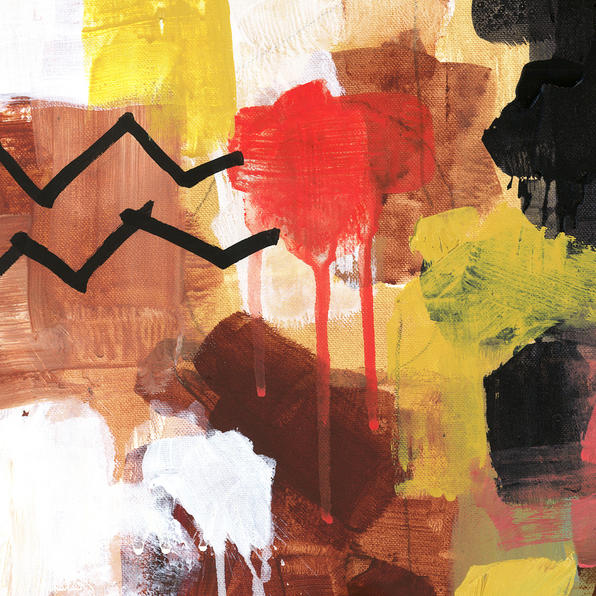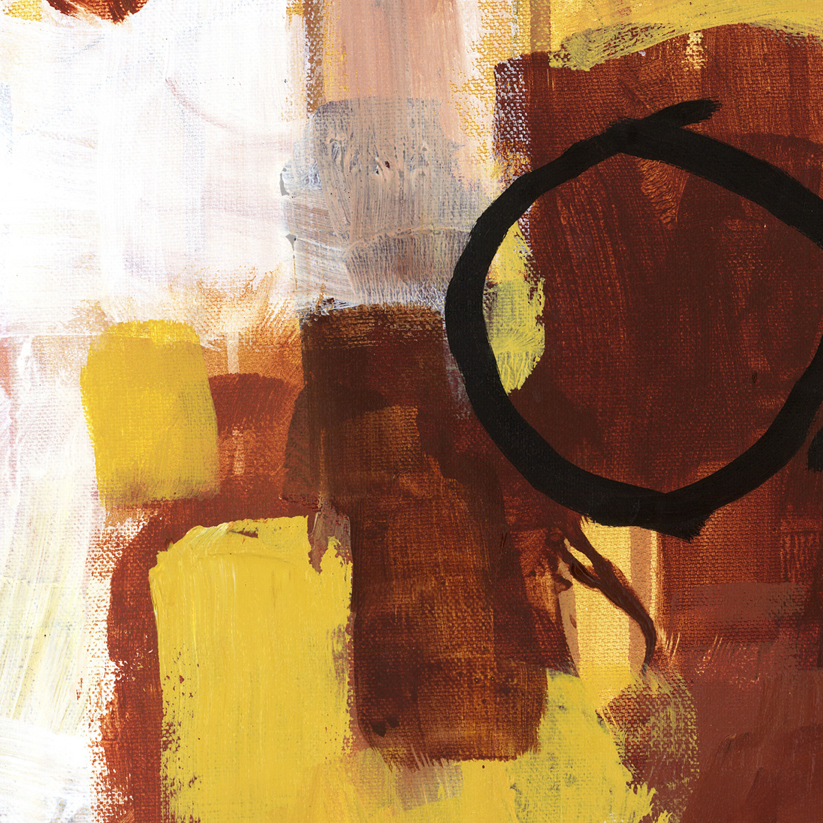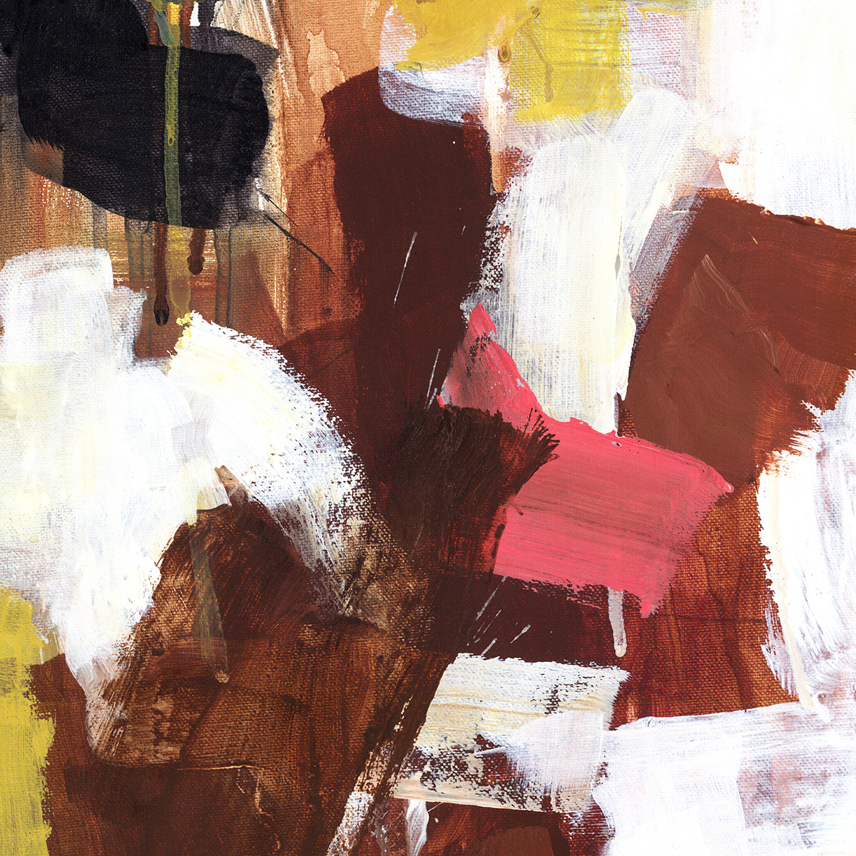 Gestural abstract painting in browns and yellows with energy escaping in all directions..