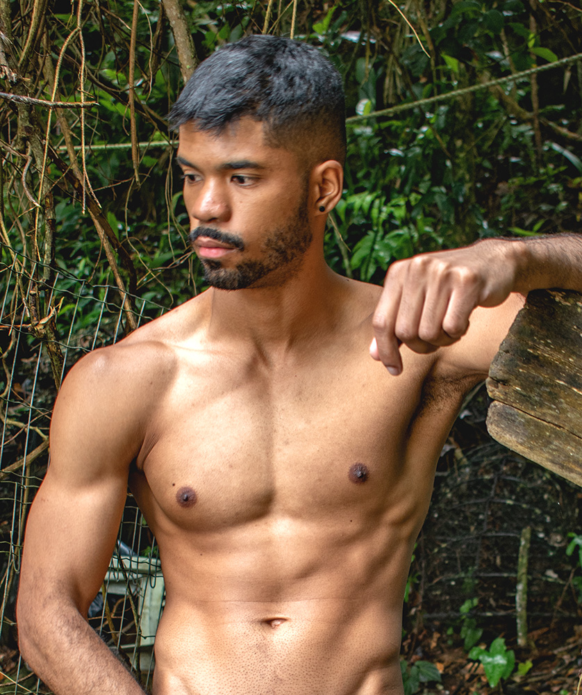 Young nude Brazilian male holding his penis and looking thoughtful.