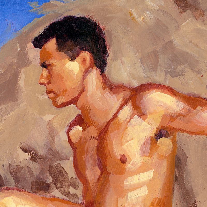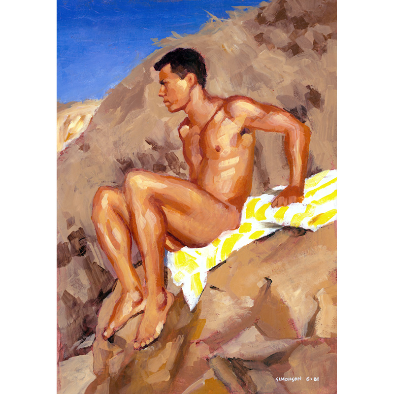 Male nude sitting on towel in rocky landscape.