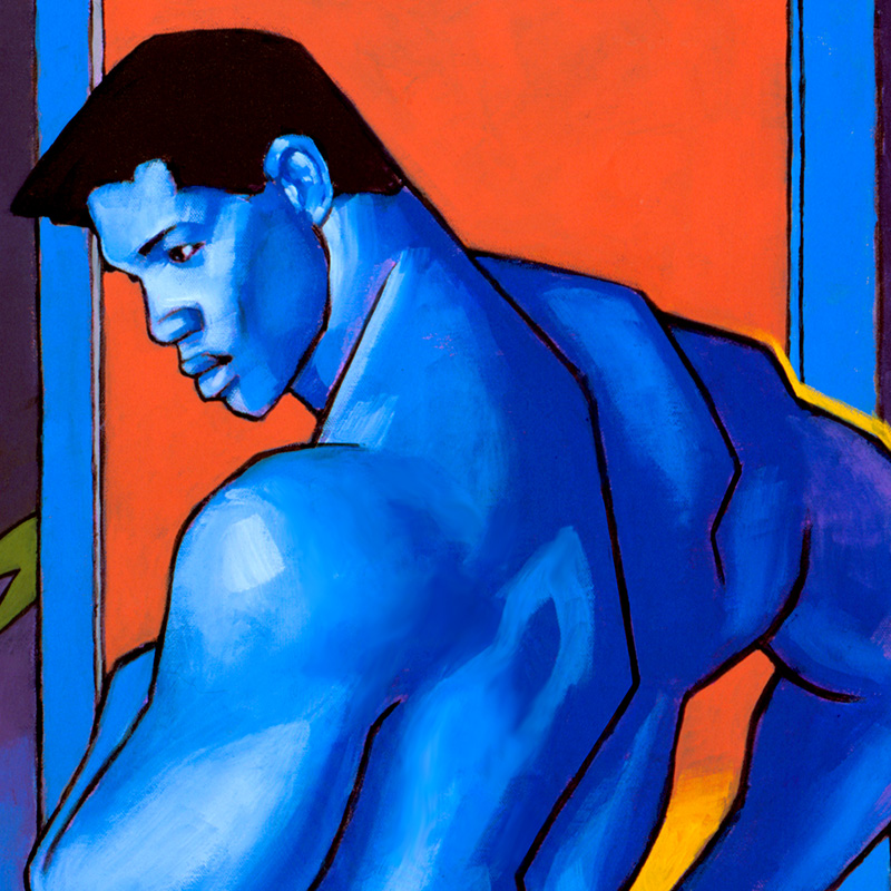 Muscular blue nude in surrealistic setting.