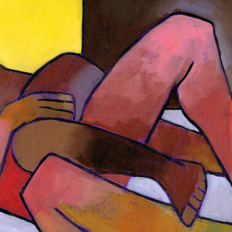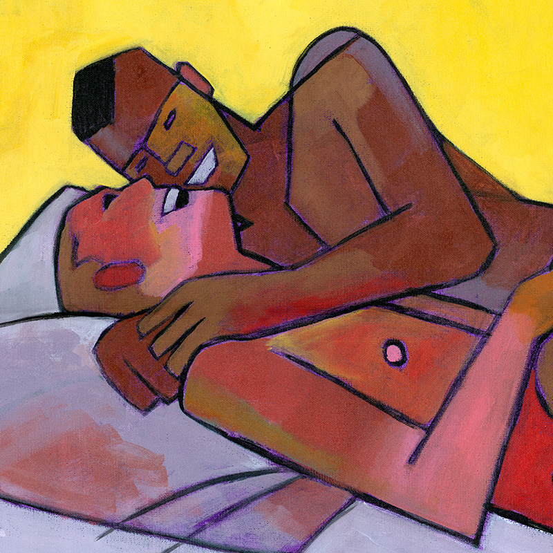 Male couple laughing in bed.