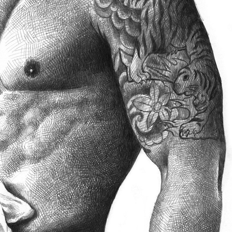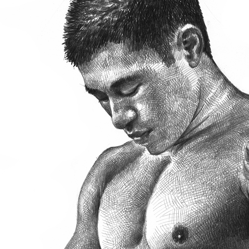 Asian bodybuilder rubbing cloth on stomach.