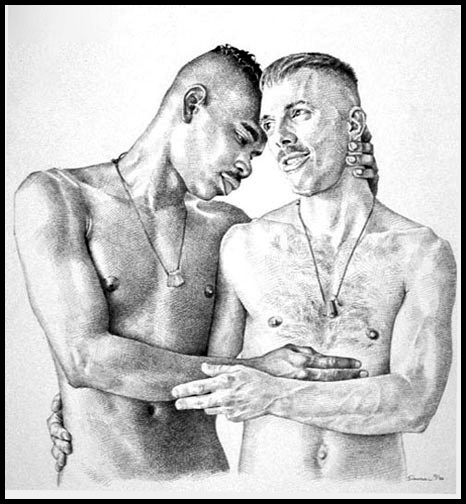 Male couple in tender embrace, from waists up