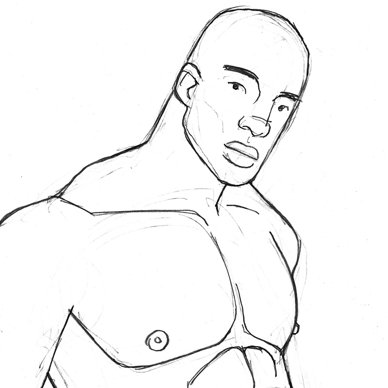 Very powerful, thick, solid black male nude in standing pose.