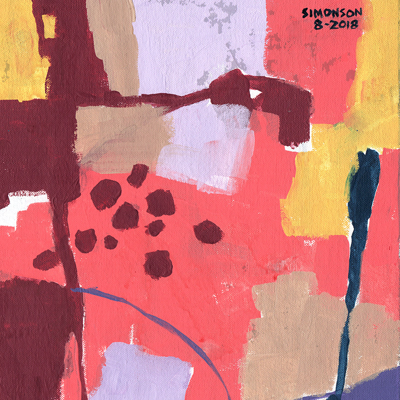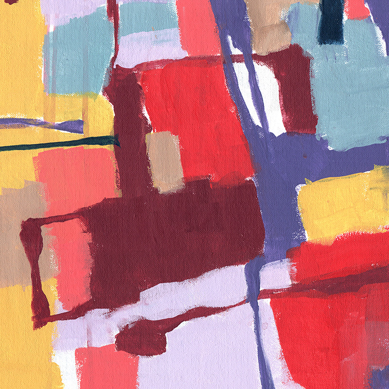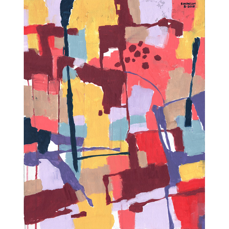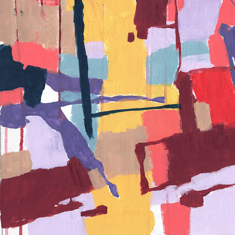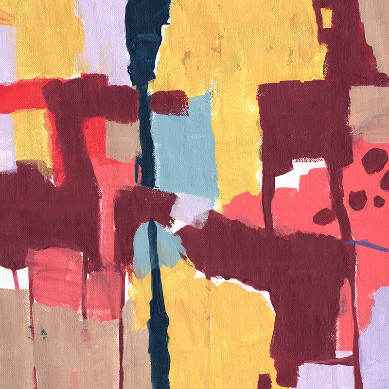 Abstract with tangle of organic shapes in reds, orange, yellows, purples.