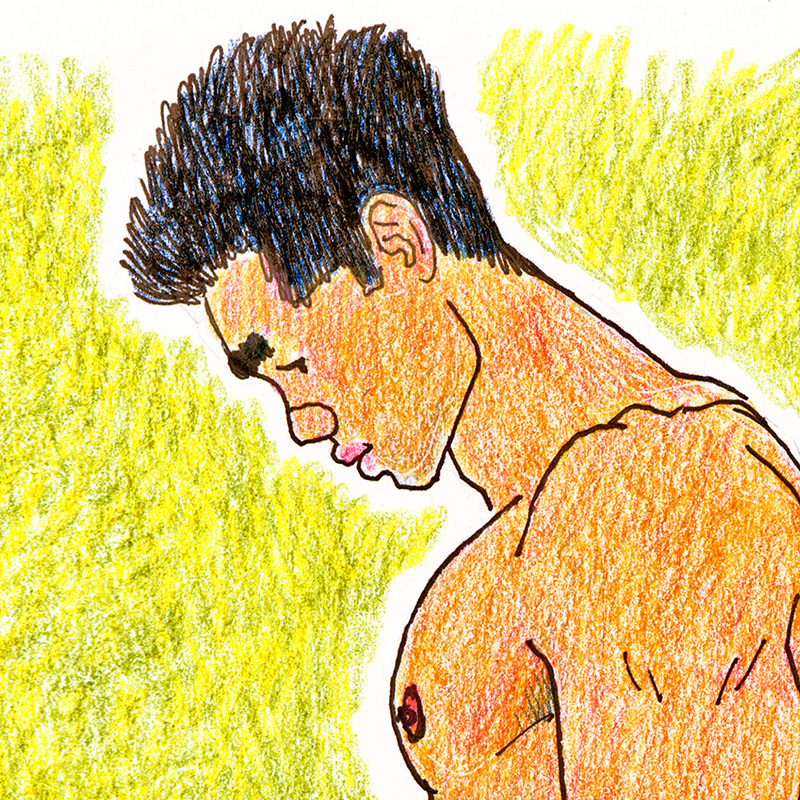 Asian nude contemplating his own erection.
