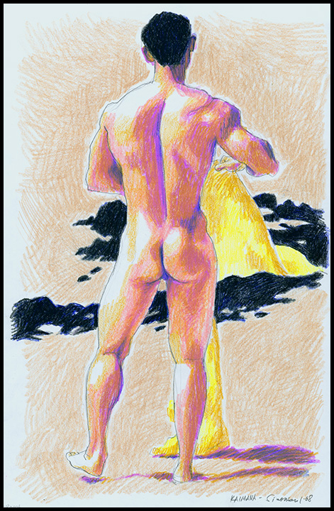 Colored-pencil drawing of standing rear nude on rocky beach