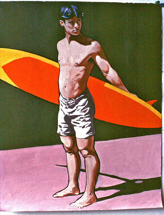 Surfer holding colorful board behind him on green and pink background (painted in oils, 1981)