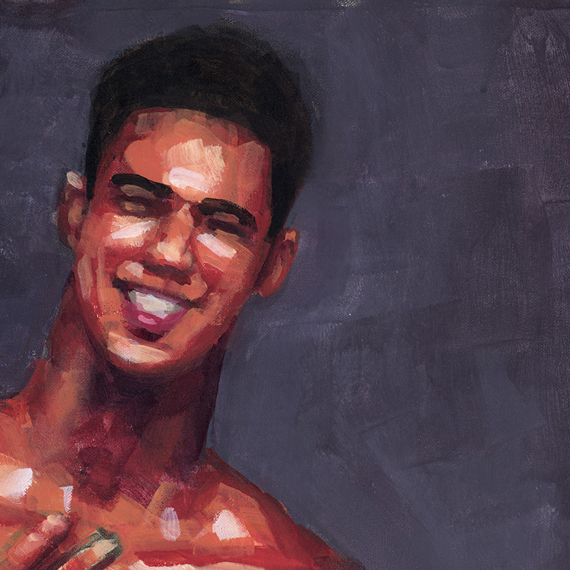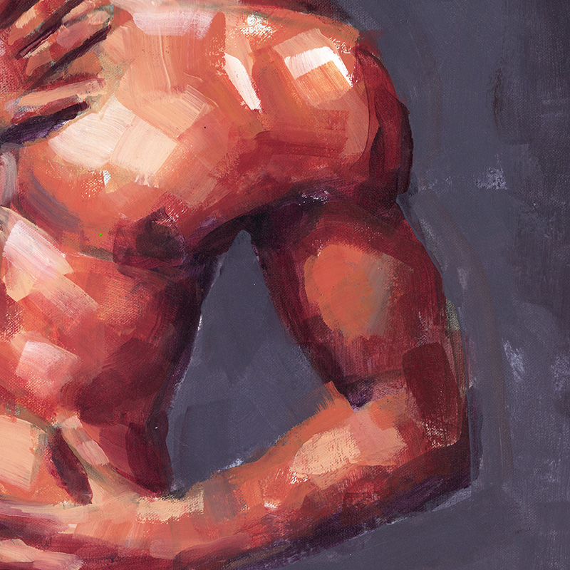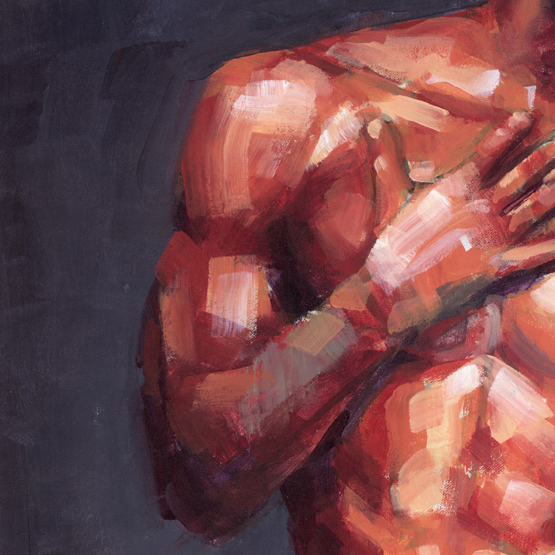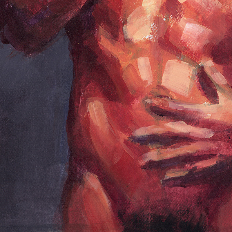 Muscular nude male laughs embarrassedly.