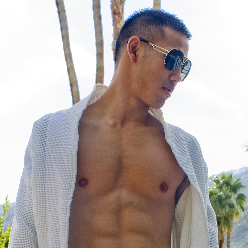Frontal nude of Asian male in open robe at poolside.