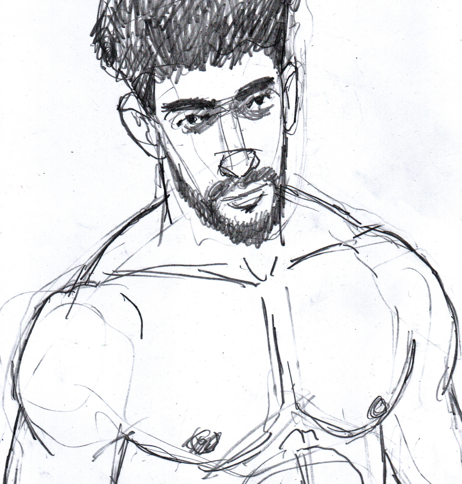 Dark-eyed and dark-haired young man with muscular build, seen from waist up.