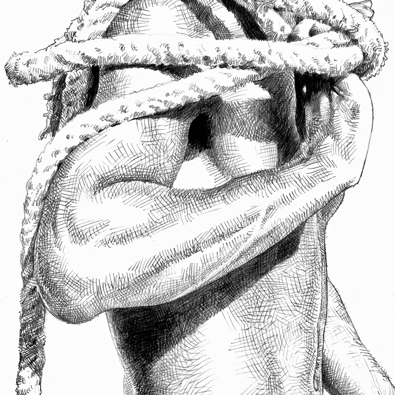 Brazilian male nude with rope over shoulder.