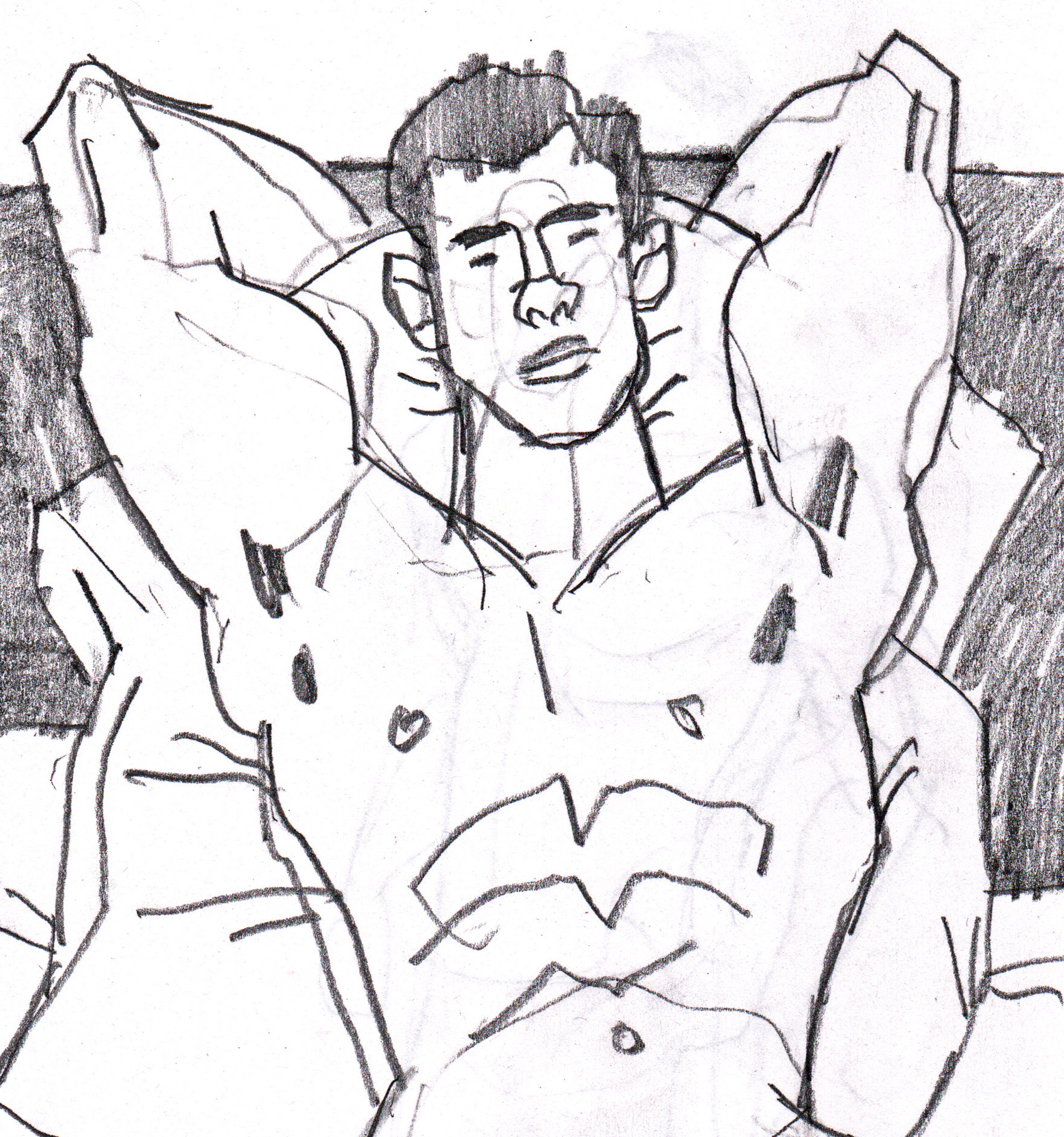 Roughly drawn pencil sketch of muscular reclining male nude.