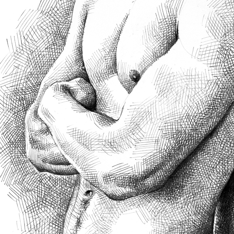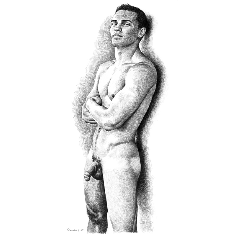 Lean young Caucasian male with folded arms leans against wall.