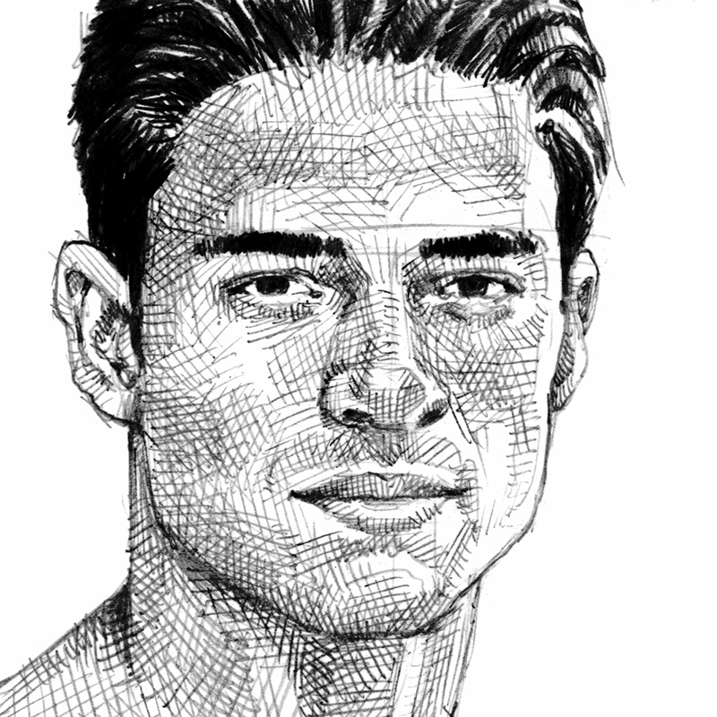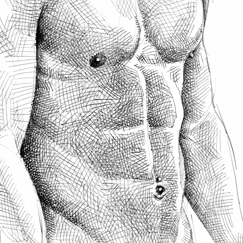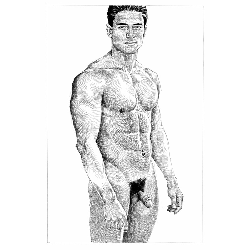 Standing frontal nude, muscular dark-haired male.