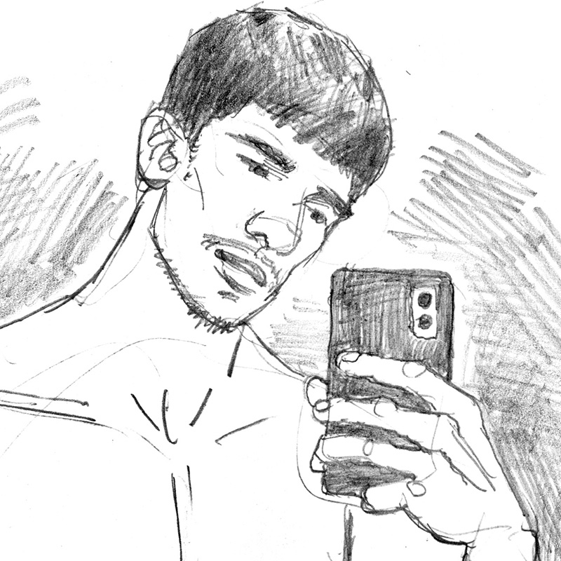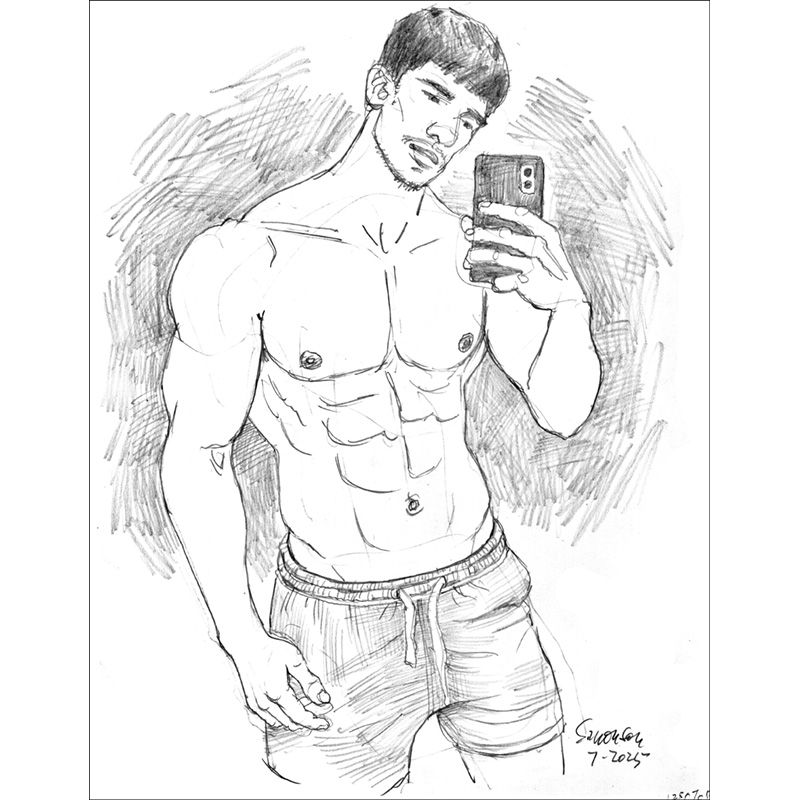 Handsome, muscular, shirtless young man in shorts takes selfie.