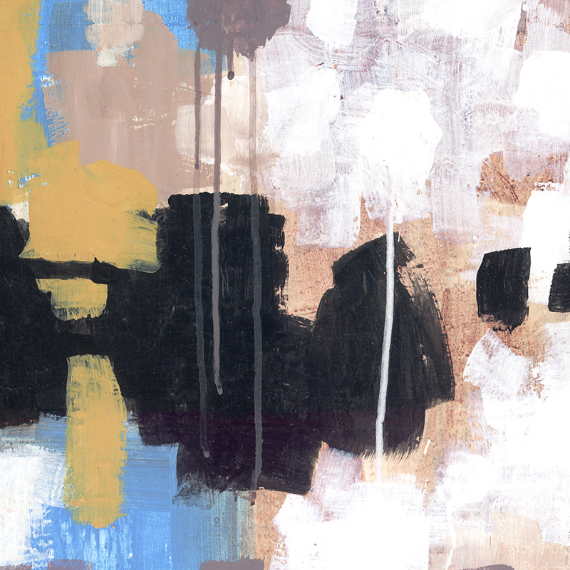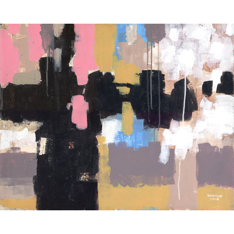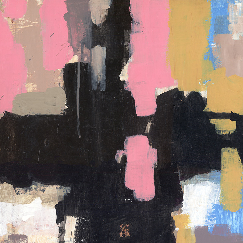 Bold, gestural abstract in black, white, tan, pink, yellow.