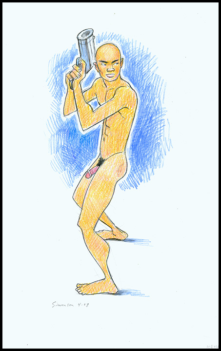 Frontal nude Asian boy on guard, holding gun