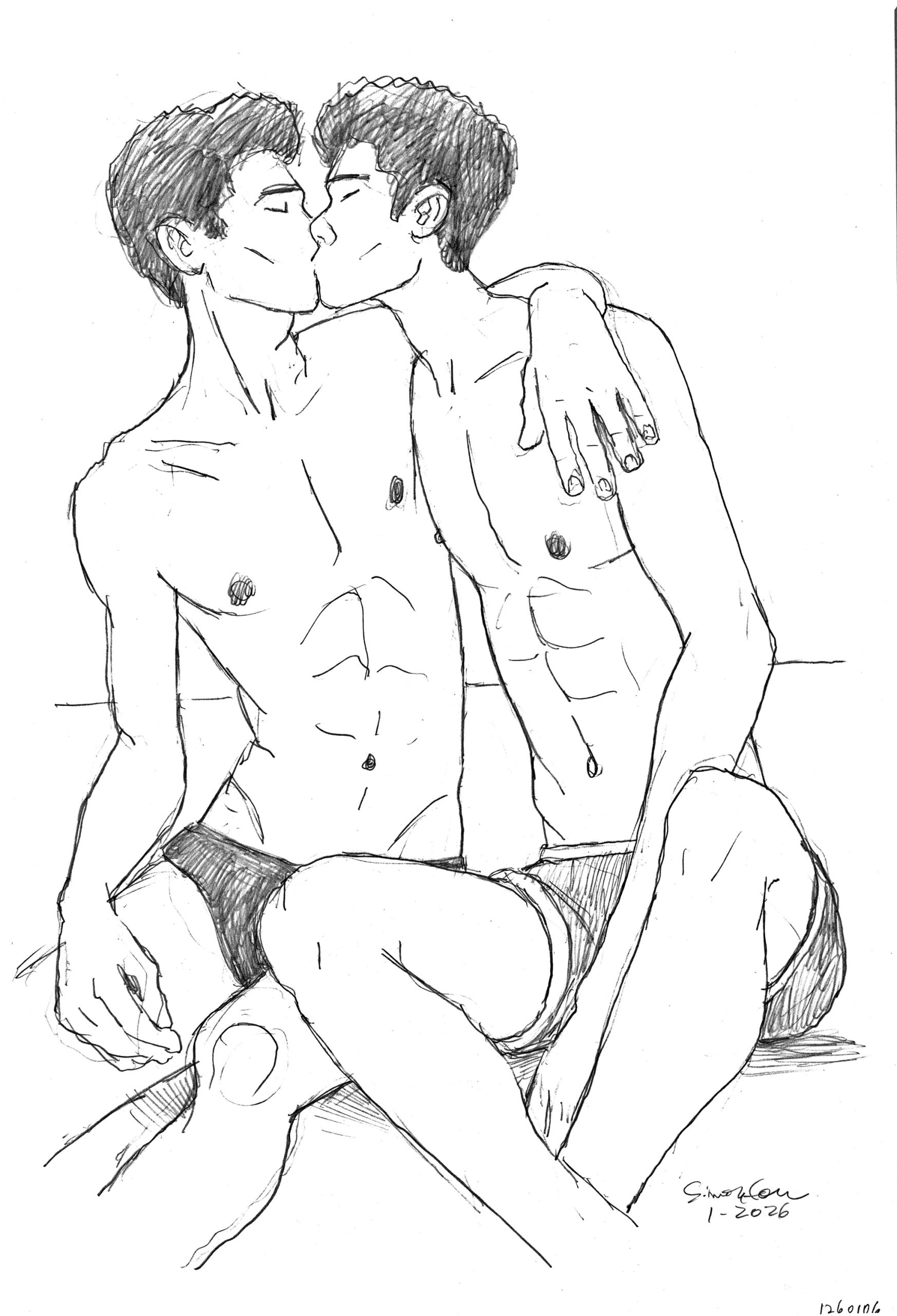 Two young men in swimsuits stealing a kiss at the beach.