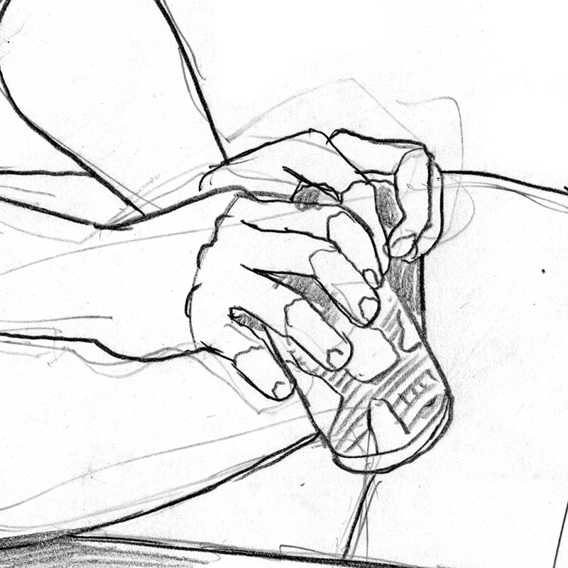 Seated male nude tapping on soda can.