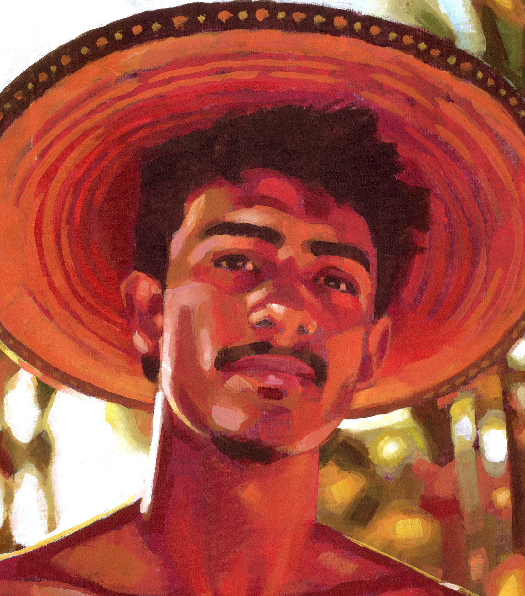 Handsome young Mexican wearing sombrero in late-afternoon light.