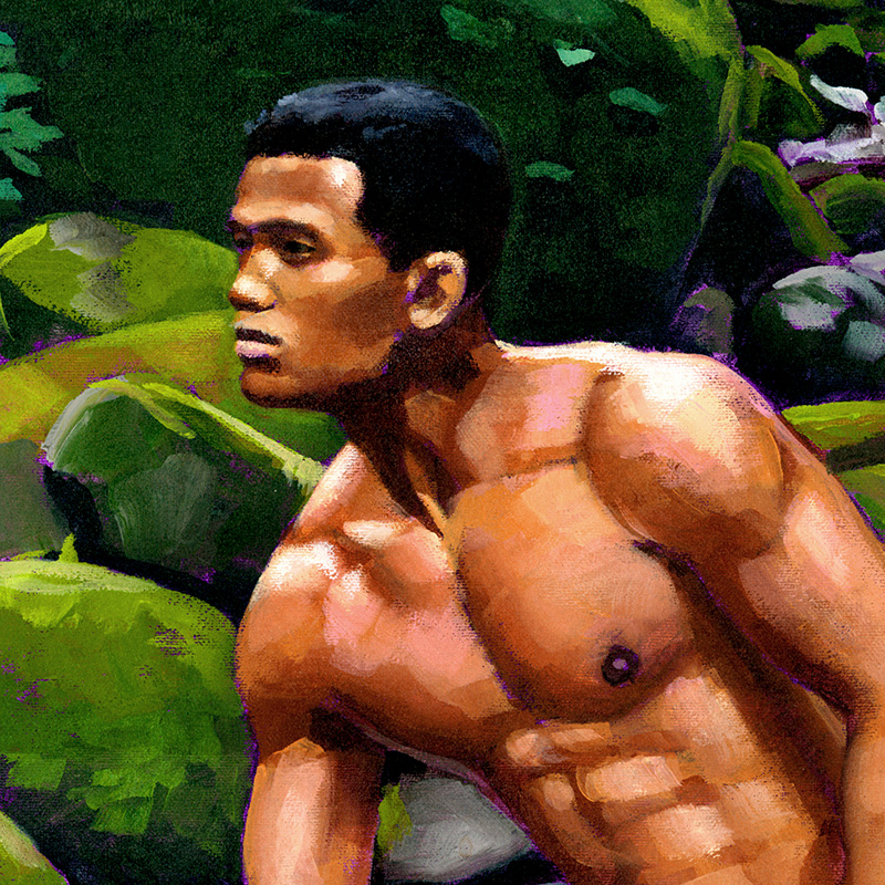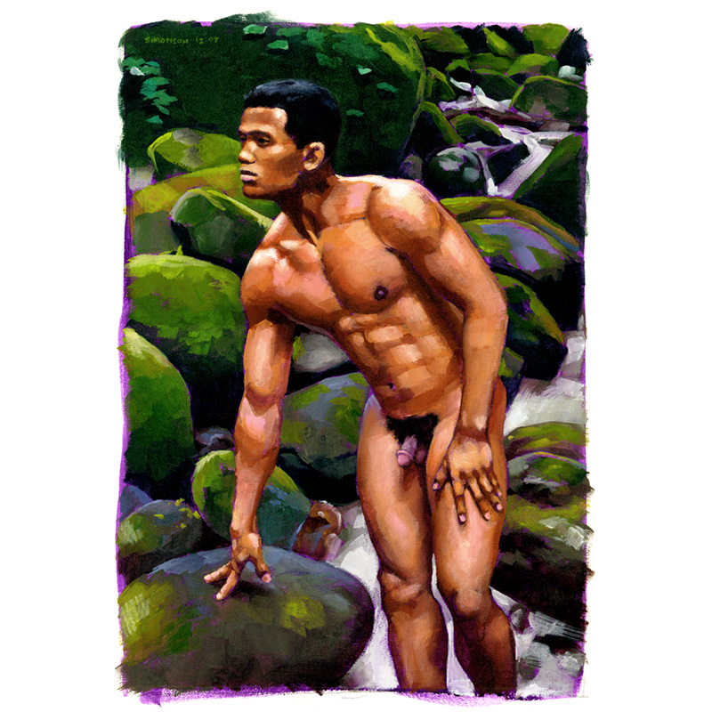Frontal Filipino nude standing in rocky stream.
