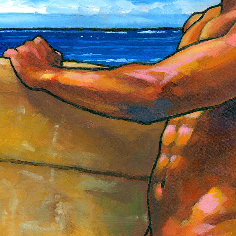 Nude surfer with surfboard on Hawaiian beach.
