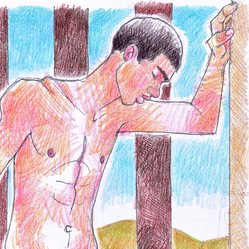 Young uncut male nude in the stables, fantasizing.