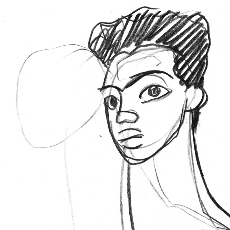 Standing side/frontal nude, boy with big eyes.