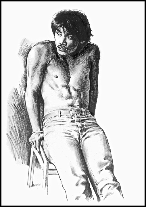 Shirtless Filipino-Hawaiian boy in jeans stretching on low stool